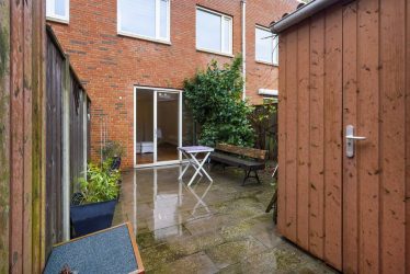 Toegang tot achtertuin met schuur en achterom.
