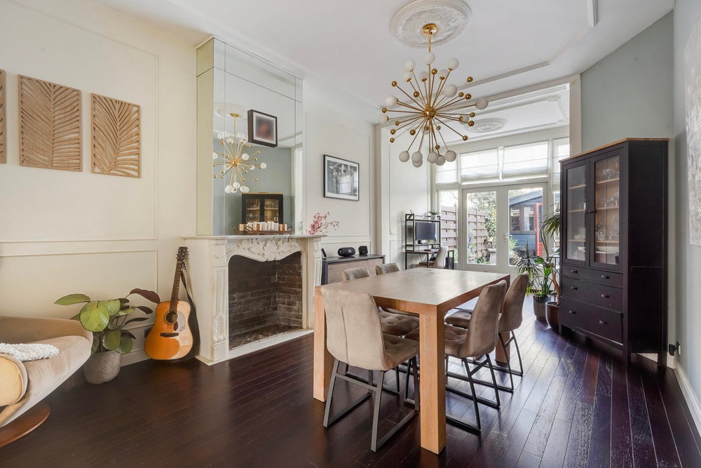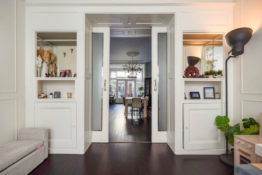 Entrance, vestibule, L-shaped hallway with WC and washbasin. The living-dining room is classical in style, featuring sliding doors and four built-in cupboards, two traditional fireplaces (non-functional), generous proportions and a practical layout. Large windows provide abundant natural light throughout the day, creating an inviting living space designed for both relaxation and entertaining. A spacious cellar is accessible via a hatch in the dining room and is fitted with a new humidity control system (2025). French doors open onto the rear garden.