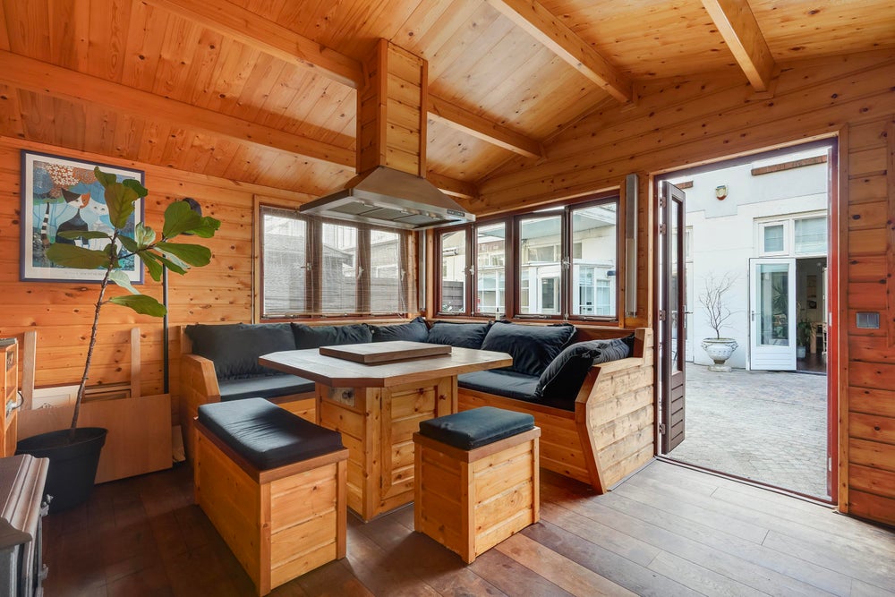 The generously sized tiled rear garden features an 18 m² garden cabin with a fireplace and a fully equipped second kitchen, including a Teppanyaki plate, electric hob, extractor hood, dishwasher, refrigerator and built-in deep fryer. This outdoor space is a valuable addition: a place to enjoy morning coffee or unwind at the end of the day. It also offers an ideal setting for quiet work or use as guest accommodation. Adjacent is a separate storage unit of approximately 7 m².