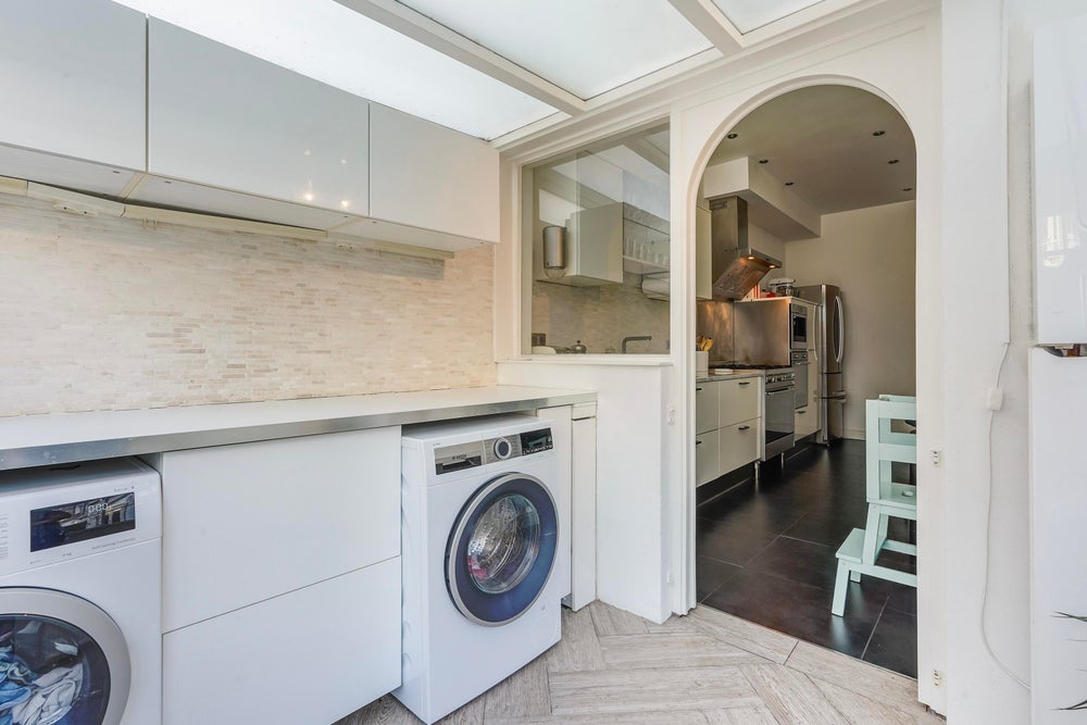 The modern kitchen is practically designed and equipped with integrated and freestanding appliances, including a six-burner gas hob, extractor fan, 90 cm oven, 60 cm oven, built-in coffee machine, dishwasher (2025) and a large fridge-freezer. The utility room is fitted with a washing machine and tumble dryer (2025), houses the central heating boiler and the new humidity control system (2025), and provides access to the rear garden.